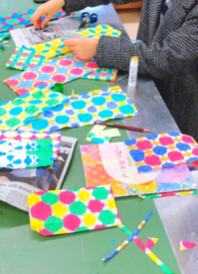 模様のフロッタージュ / 葉っぱのフロッタージュ / 再生コラージュ / 折り染め(染めの工程)/ 折り染め(加工の工程)/ 落ち葉の塗り絵 / ステンシル / 切り紙 / 曼荼羅アート